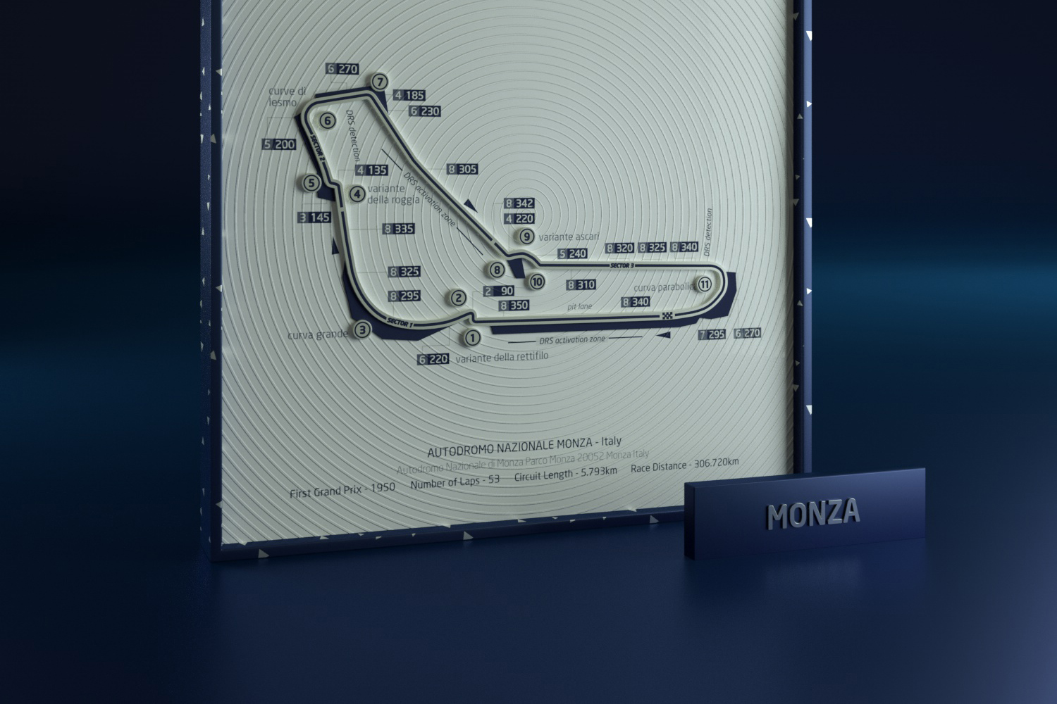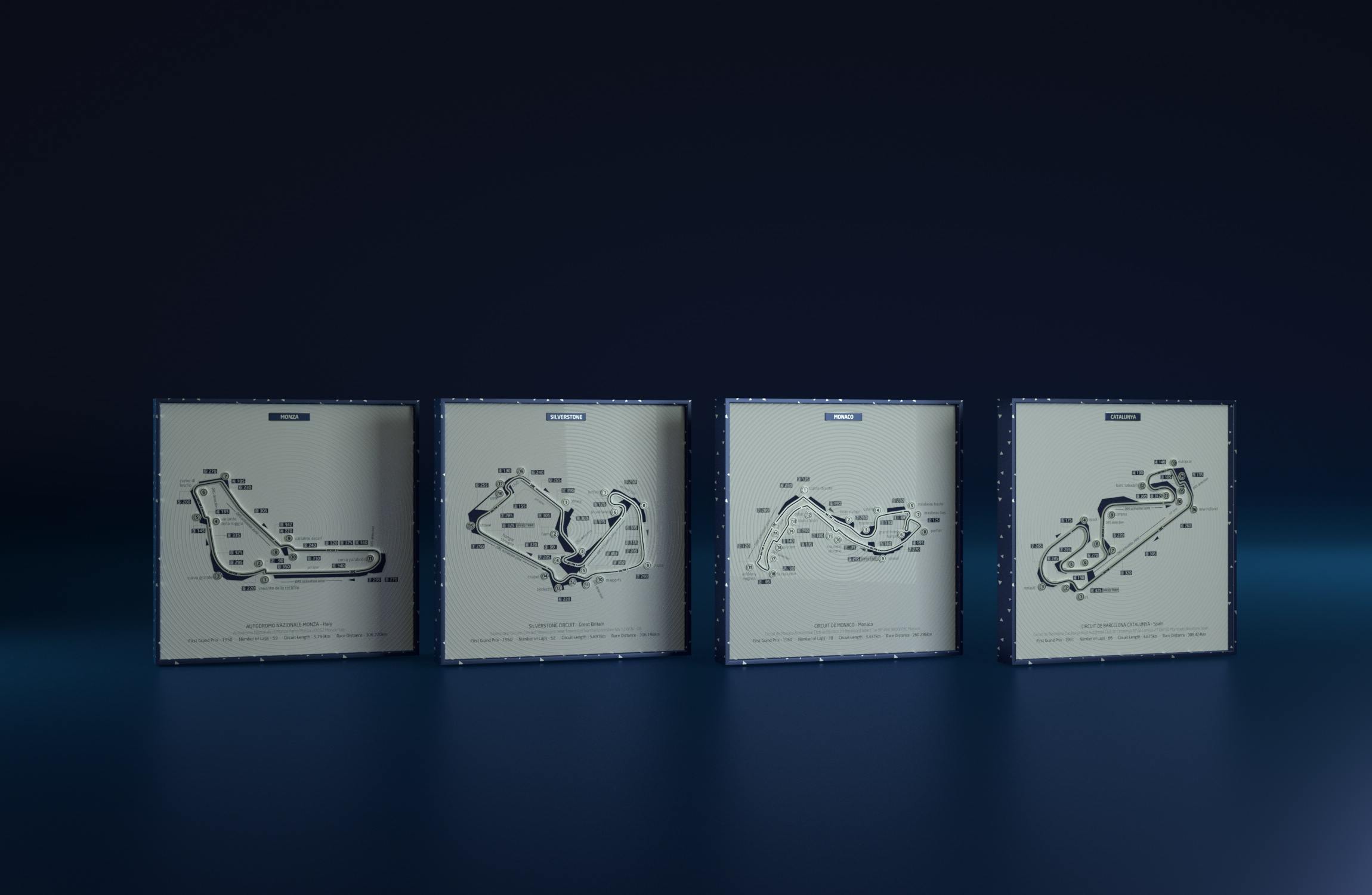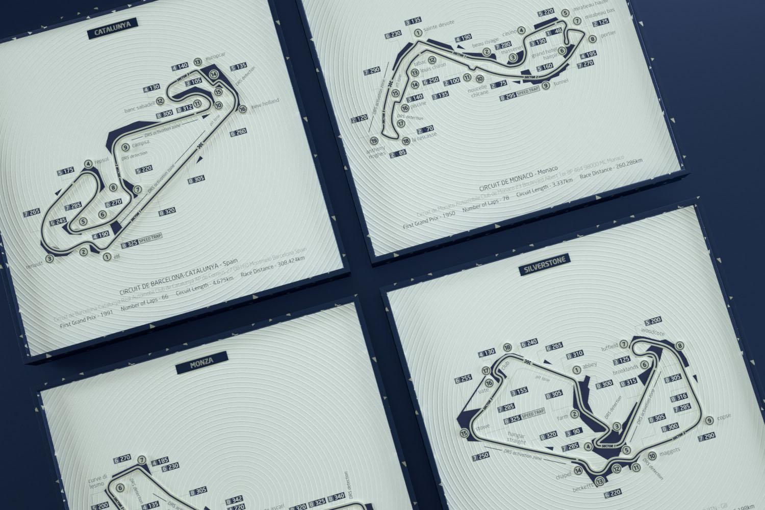 In the F1 racetrack art design, we have incorporated intricate track information and multi-level textures. This includes Italy’s Monza circuit, Spain’s Catalunya circuit, the UK’s Silverstone track, and Monaco’s Monte Carlo circuit.