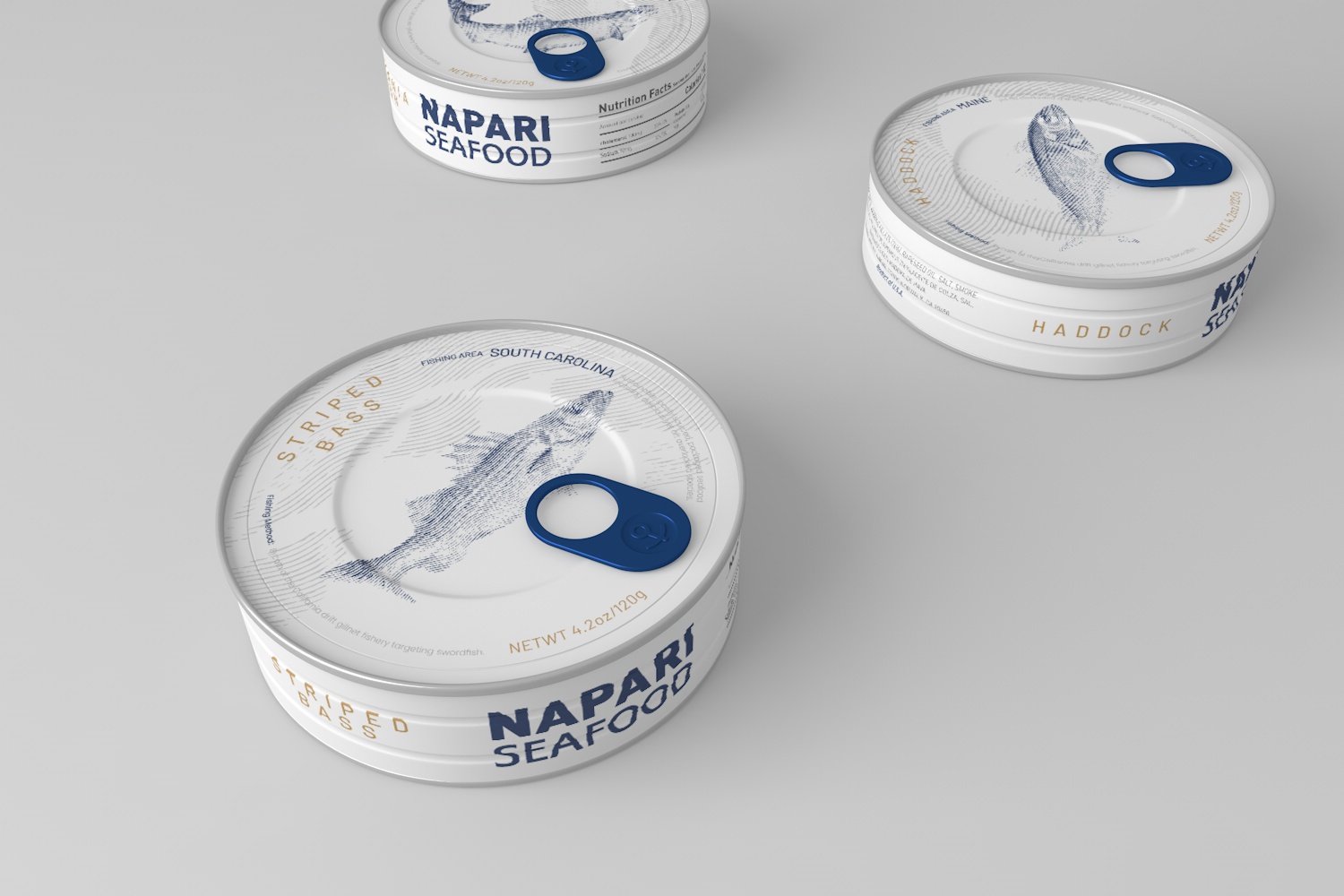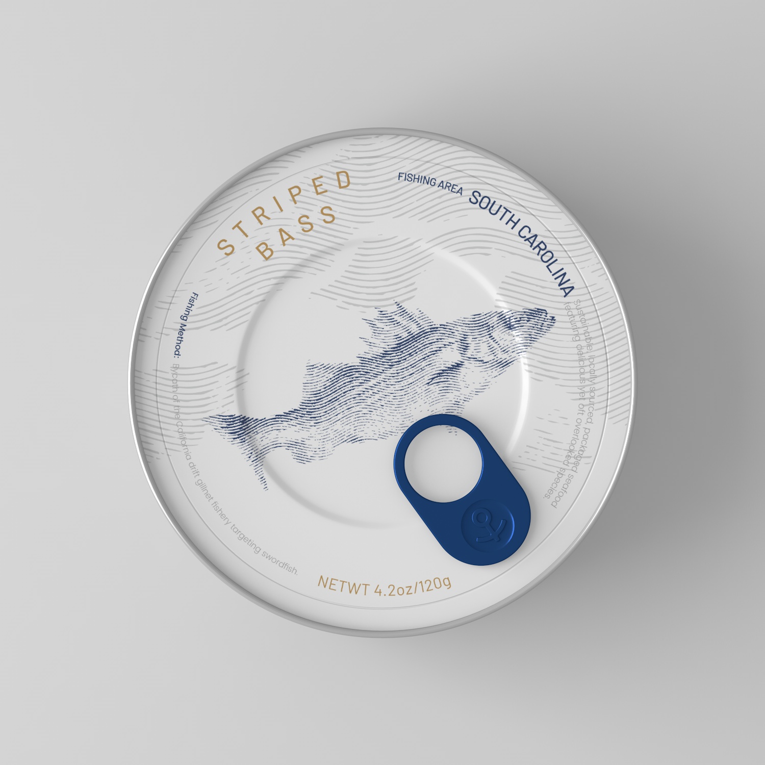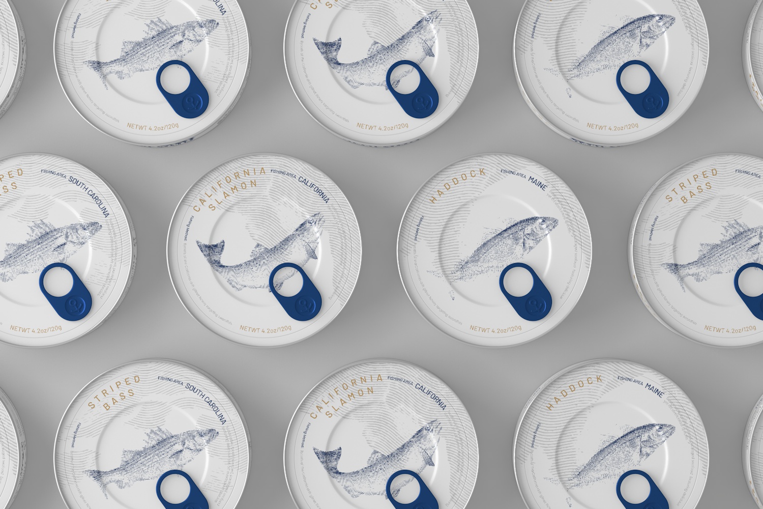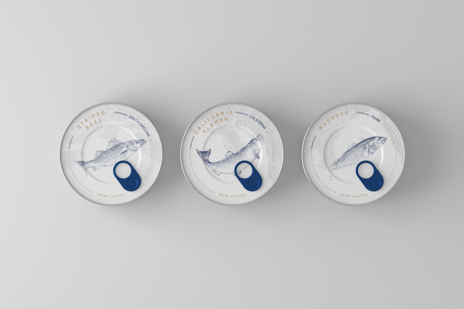 For canned packaging design, we used textured illustrations to depict these fish, and their habitat, the bay, is also represented on the packaging.