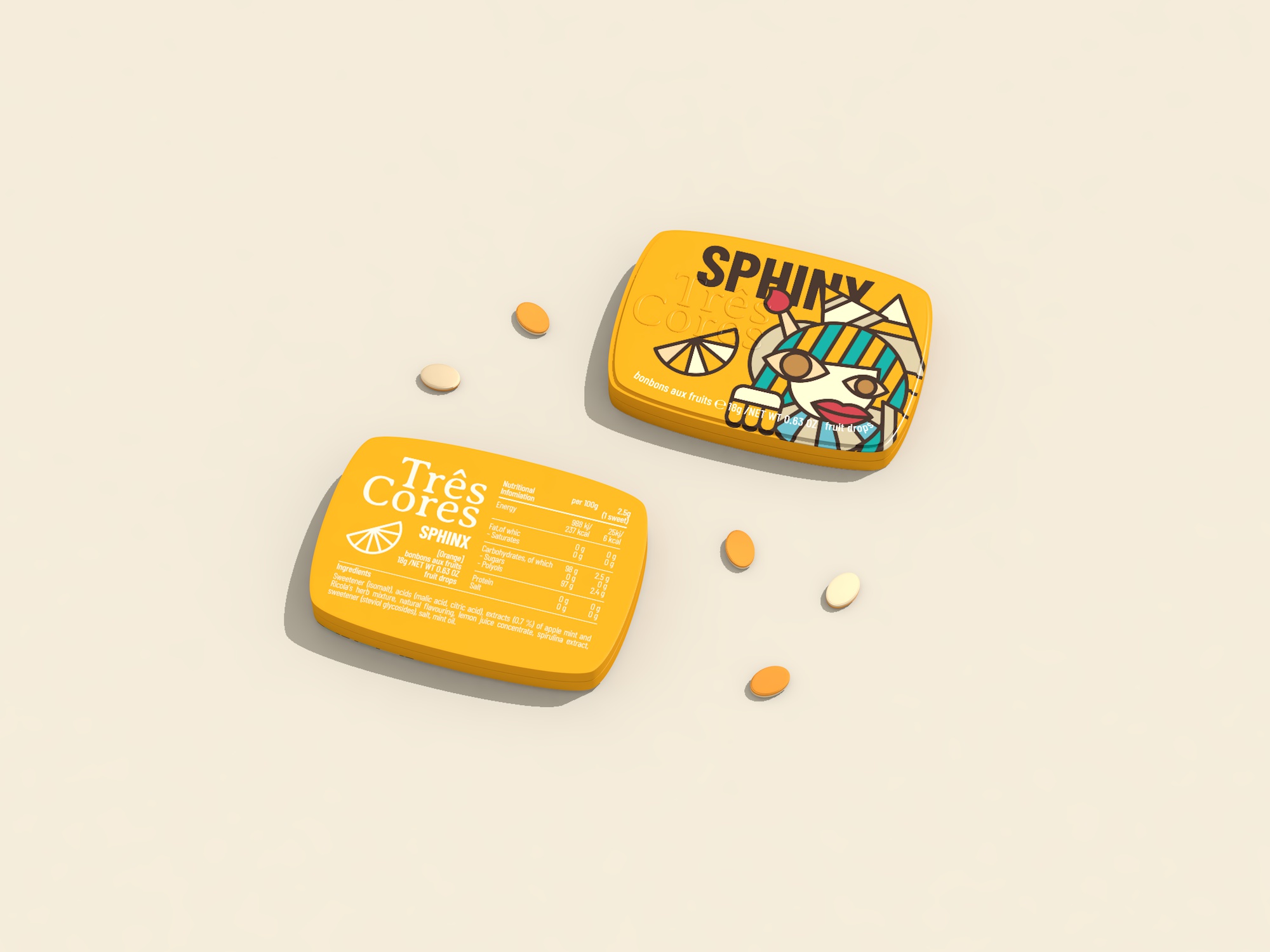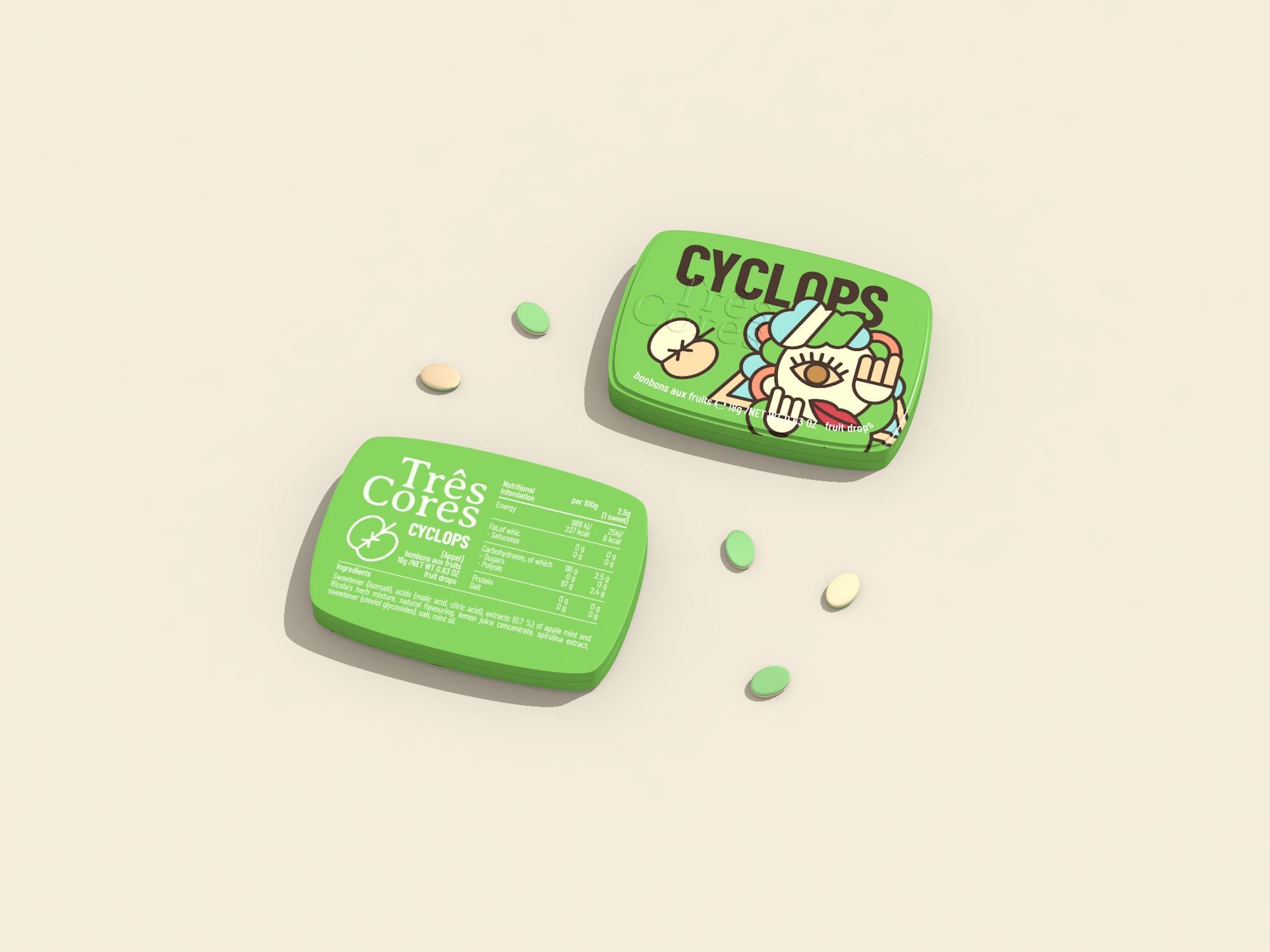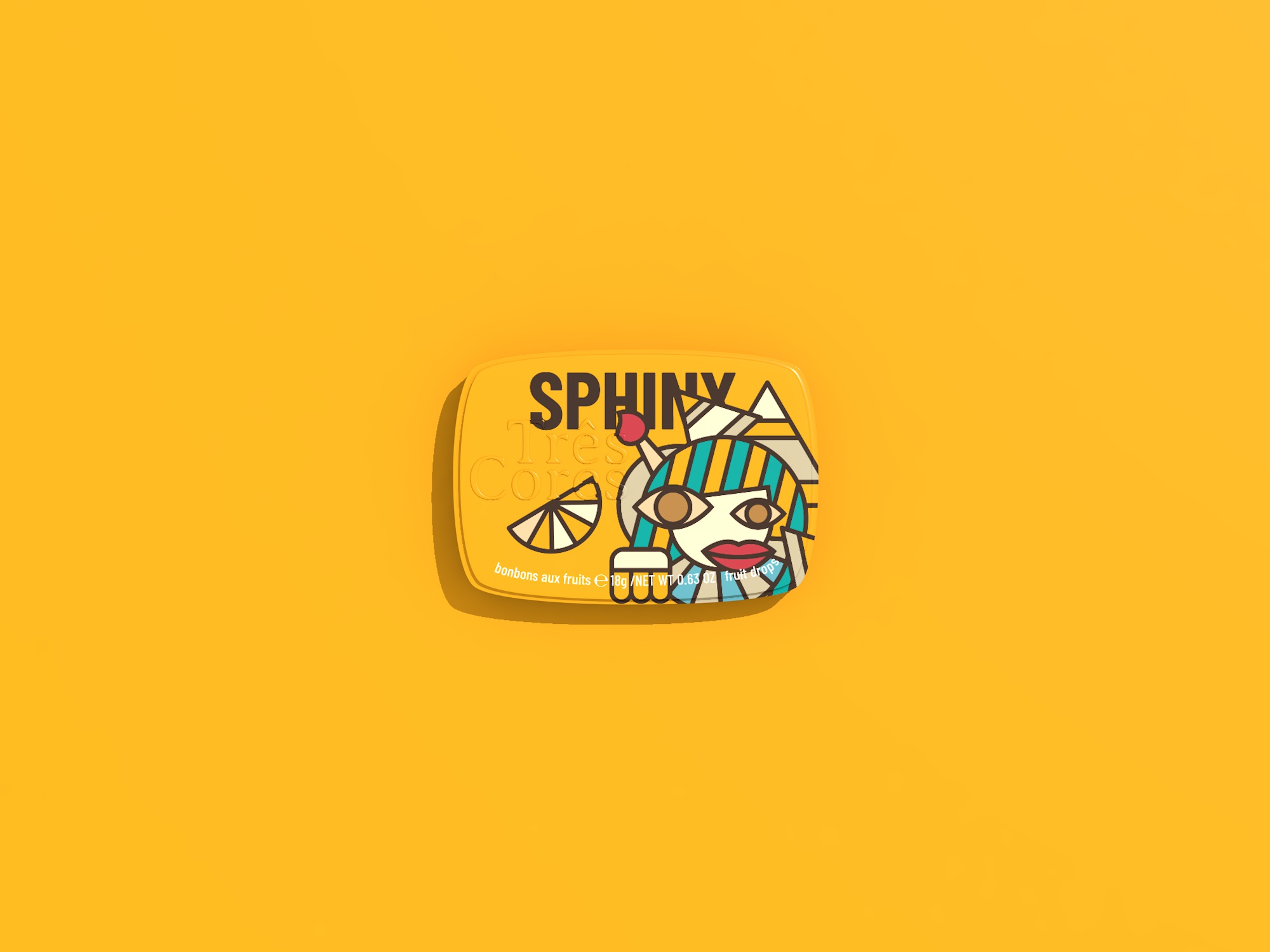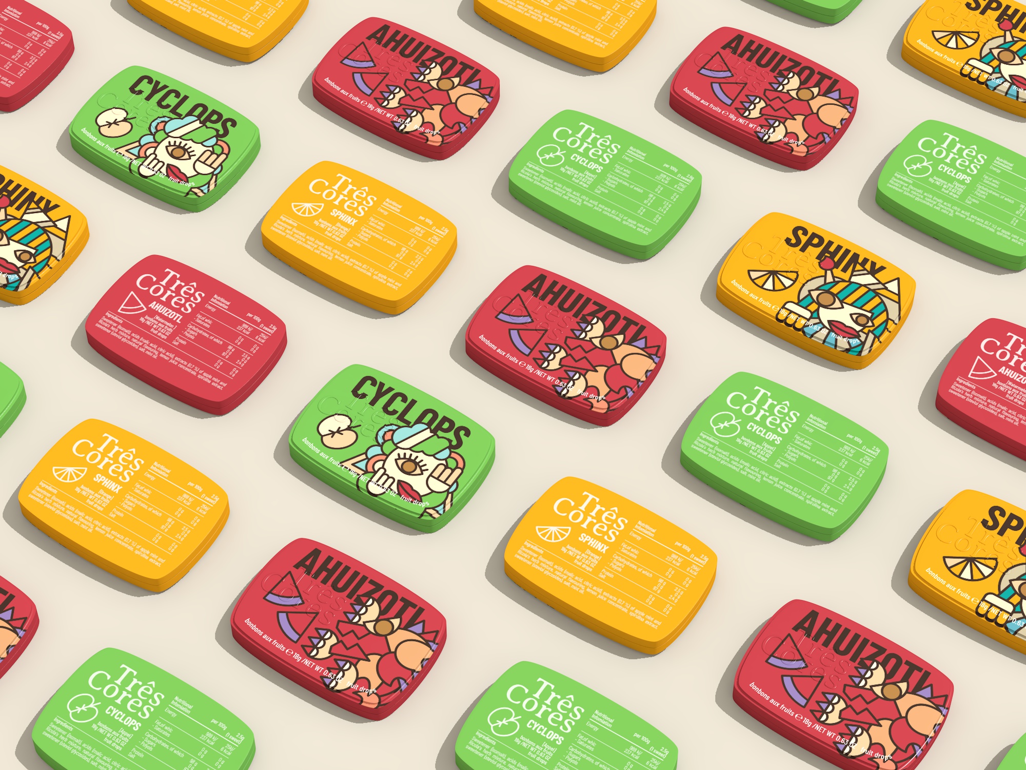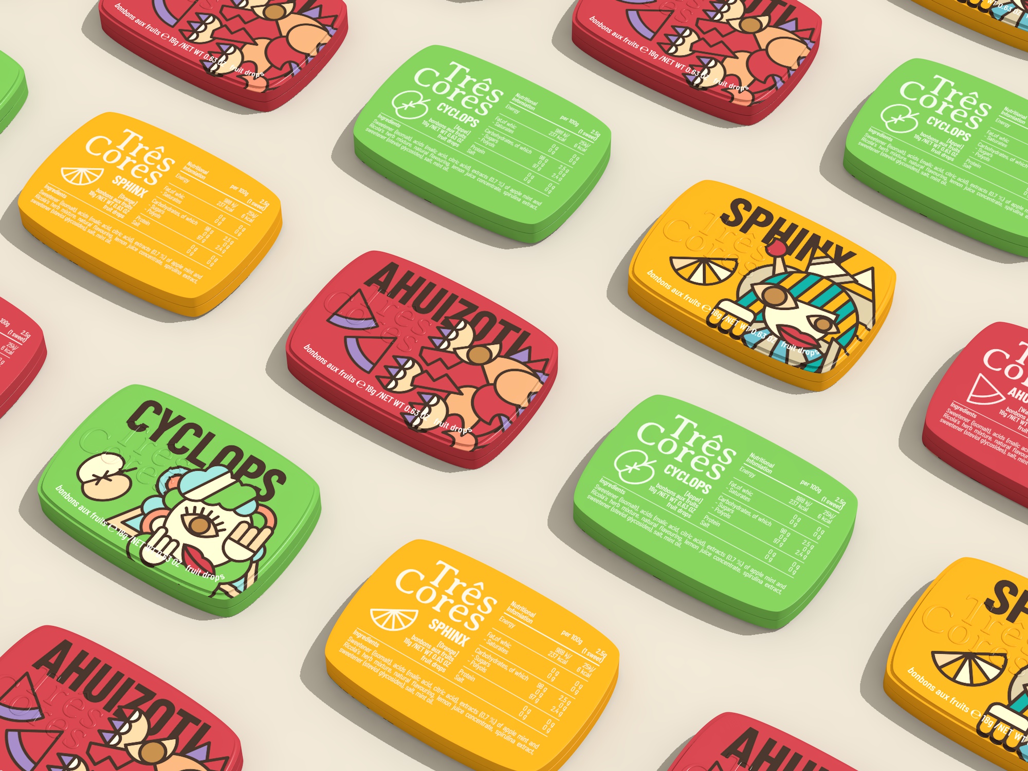 For the themed candy packaging design, within the mythical creature theme we have included the three-armed dog Ahuizotl, the one-eyed giant Cyclops, and the lion-bodied, human-headed Sphinx.